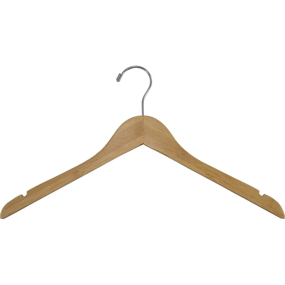 Eco-friendly and a great alternative to hardwood. These bamboo hangers feature a space-saving flat body, two precision routed notches for the option of hanging straps, and a European ball end swivel hook in polished chrome. Finished with a double coating of lacquer to prevent splintering, these well-constructed hangers will last you a lifetime.